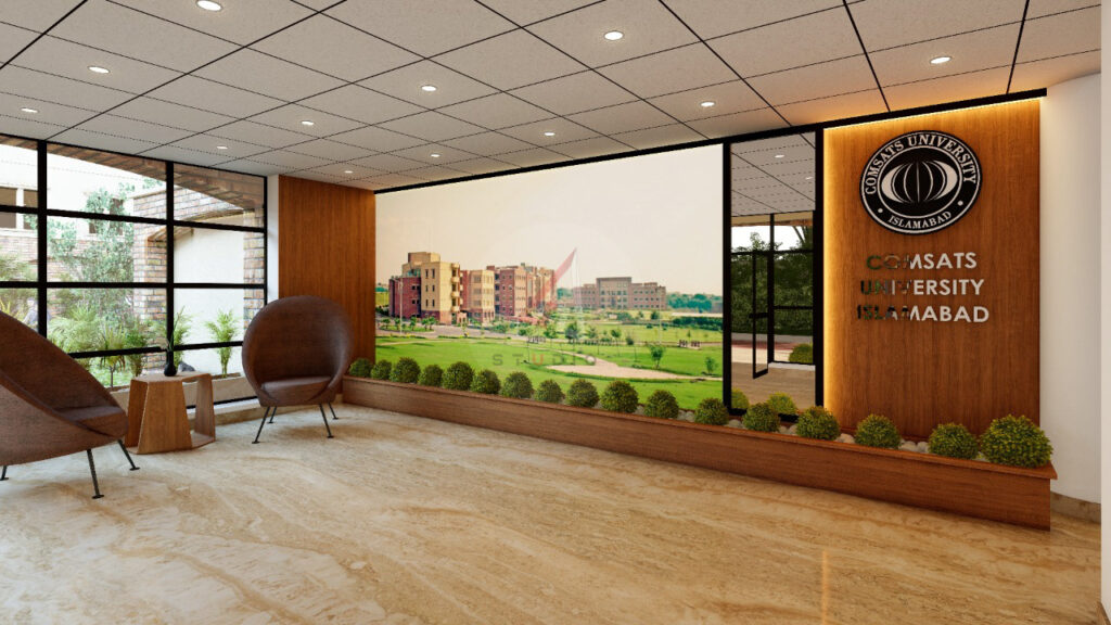 This project involves the complete interior design and execution of the Admin Lobby at COMSATS University Islamabad (Islamabad Campus). The scope of work covered the entire interior development, from initial concept and space planning to material selection, lighting design, ceiling treatments, wall finishes, and furniture layout.