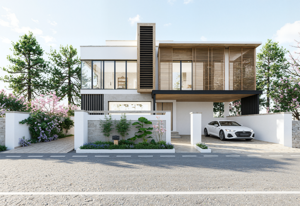 to complement the overall design. This villa exterior is ideal for clients seeking a luxurious, modern, and