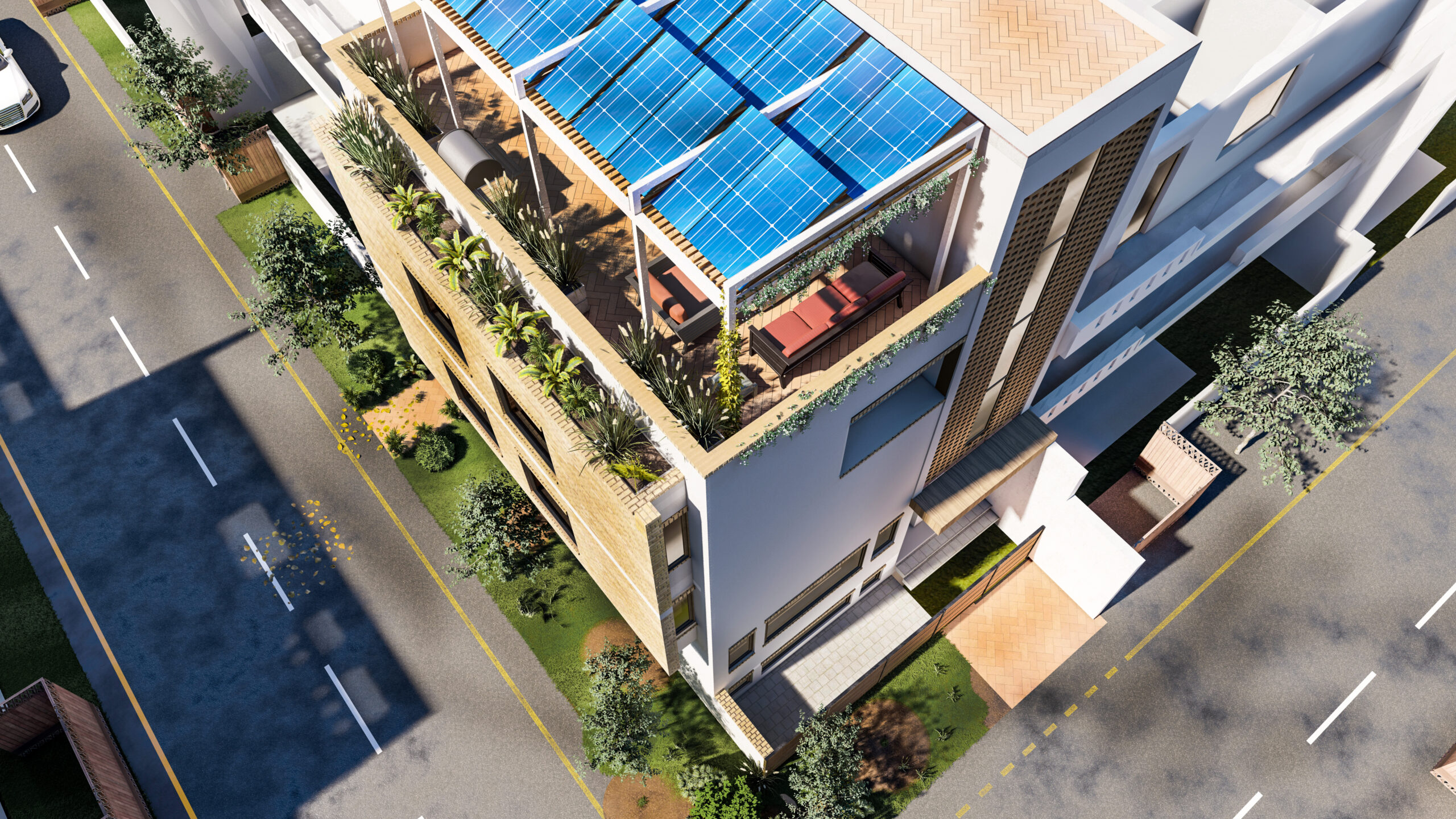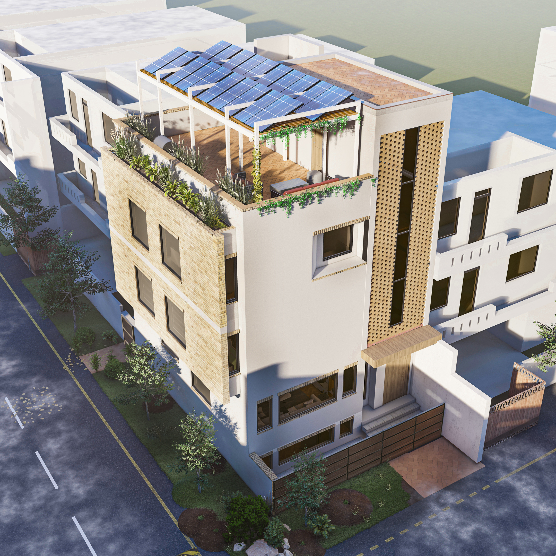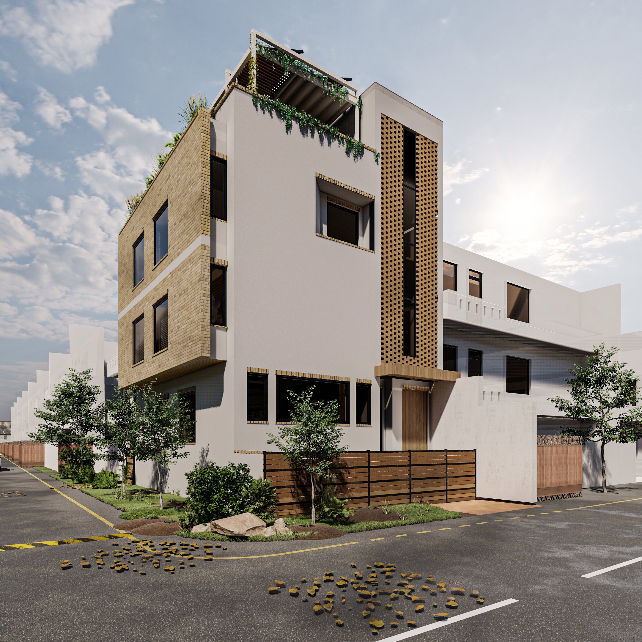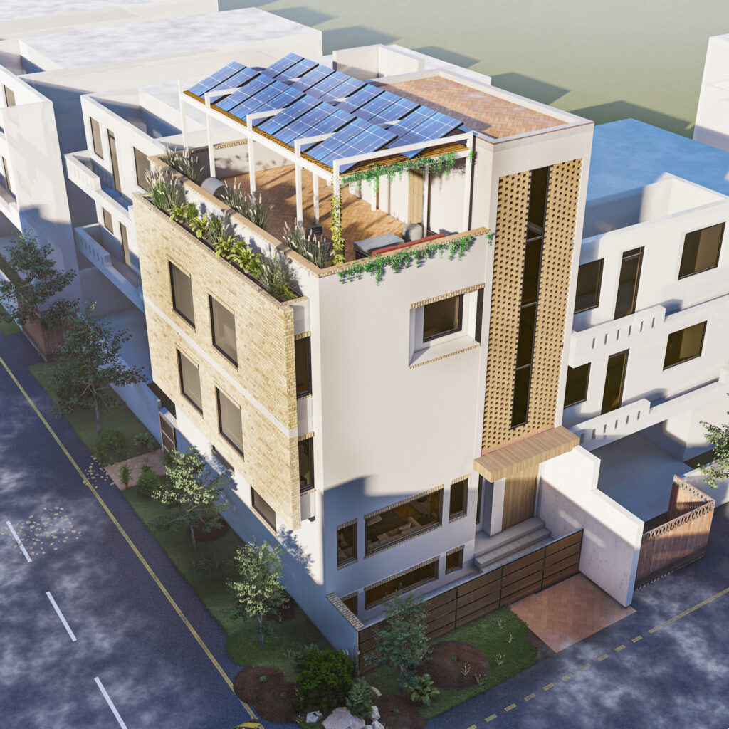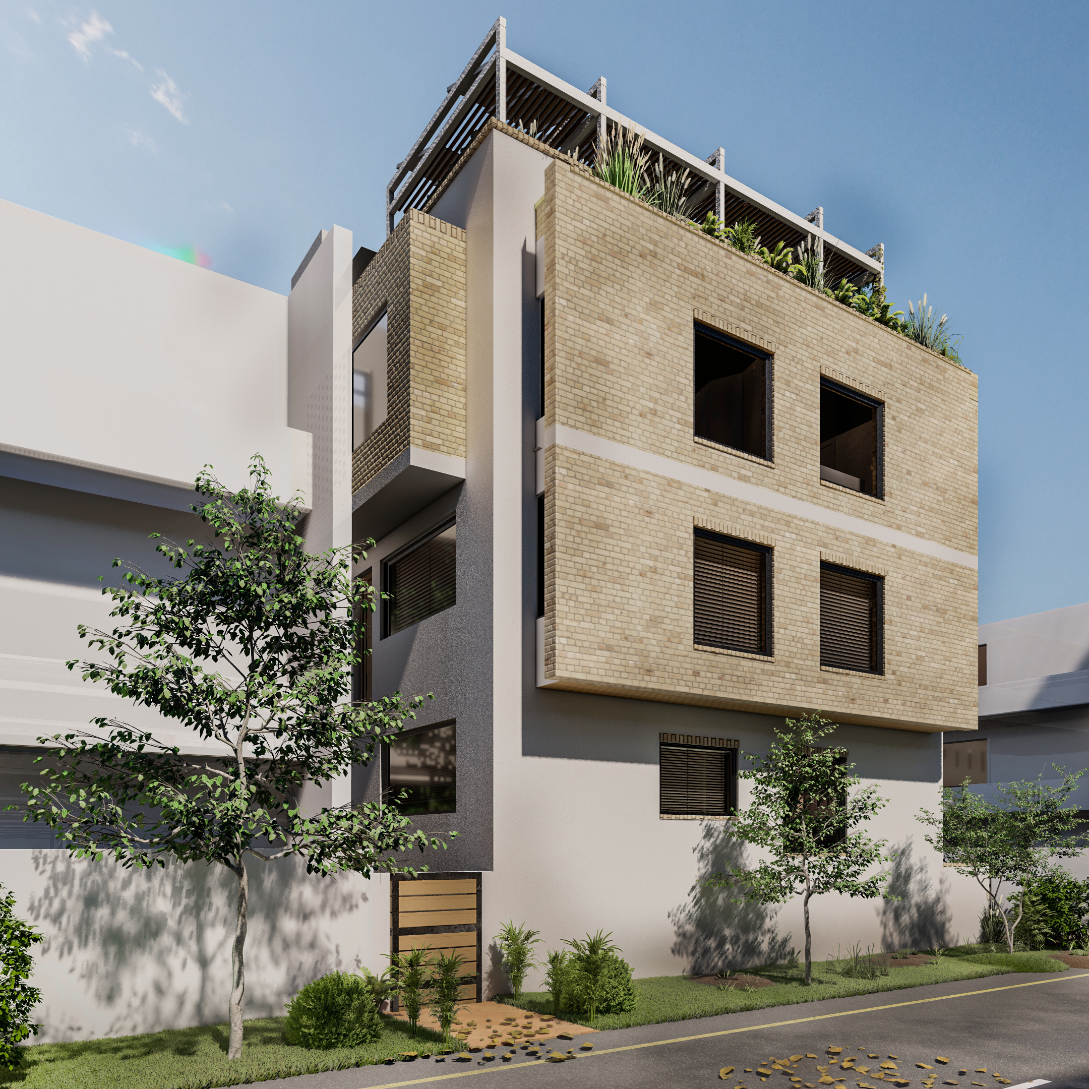 Urban Edge is a 1000 sqft, three-story residential unit designed in a contemporary architectural style, featuring a mezzanine floor that adds complexity and spatial depth to the overall planning. The project involved a challenging layout and façade development due